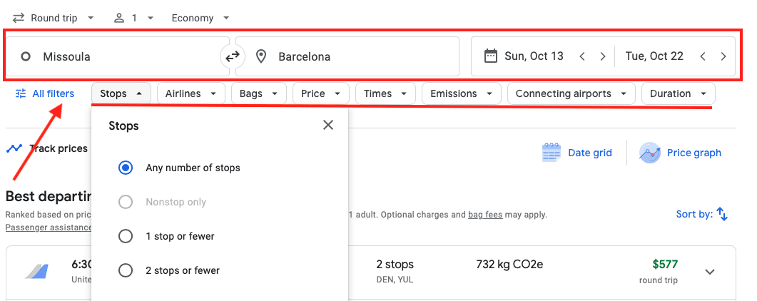 These filters can help narrow your flight options according to your preferences and travel requirements. I like to keep these filters broad at first, see what prices and flights are presented, and then narrow down the search criteria. If my travel dates are flexible, I’ll leave filters broad because sometimes I can save hundreds of dollars with an overnight or longer layover in a cool European city like Amsterdam, where public transportation makes it easy to leave the airport.