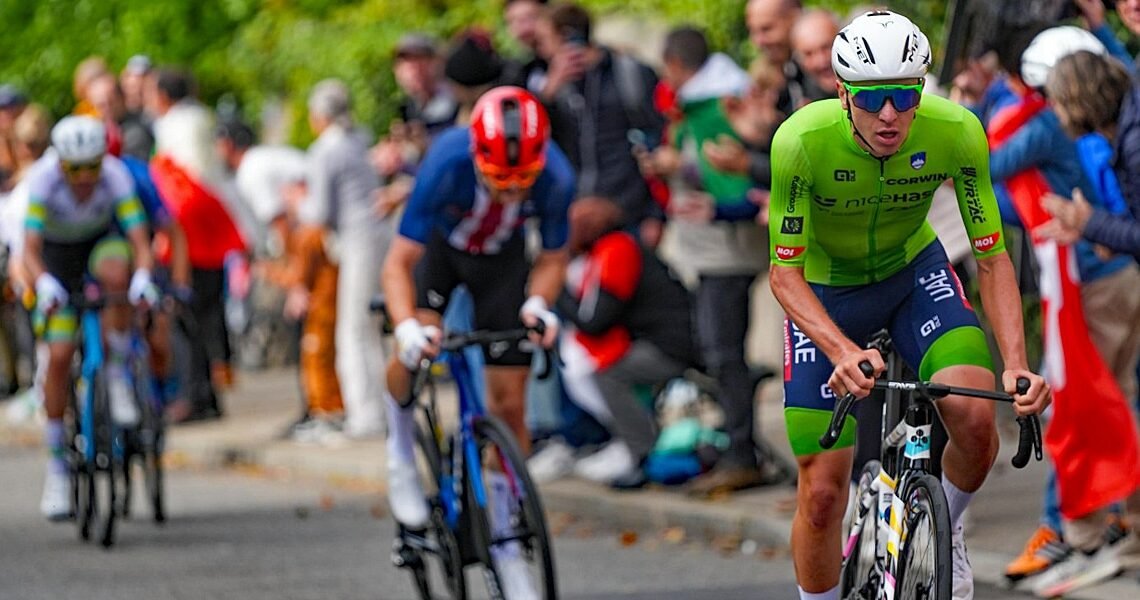 The pace was high from the start on the flat opening section. Three riders got away in the wet conditions: Cole Kessler (USA), Lewis Bower (New Zealand) and Robert Donaldson (Great Britain). They had a 1 minute lead at the Binz (1.5km at 9.2%), the climb towards the final lap. Here Alastair Mackellar counter-attacked, but the Australian was stuck between break and peloton. He was caught soon after. With 120 kilometres to go, Kessler, Bower and Donaldson were also caught. When they crossed the finish line for the first time the peloton was all together, although many riders had already been dropped, including European champion Huub Artz. The first time up the Zürichbergstrasse (1.1km at 8%), top favourite Isaac Del Toro put in a hard effort. This led to an elite group, but the peloton came back. Callum Thornley (Great Britain) and Artem Shmidt (United States) created a gap. They held on at the front for a while, but were caught at the second passage through the finish. On the next climb of the Zürichbergstrasse, Antonio Morgado made a move. The Portuguese rider, who was fifth in the Tour of Flanders this year, had Davide de Pretto (Italy) with him, but they didn’t hold out for long. The peloton, which was thinning out further and further, returned and the attacks didn’t stop. Tibor del Grosso put the others under pressure on a technical descent. This led to a split, but the Swiss rider didn’t keep it going and it was all together again just after the start of the penultimate lap.