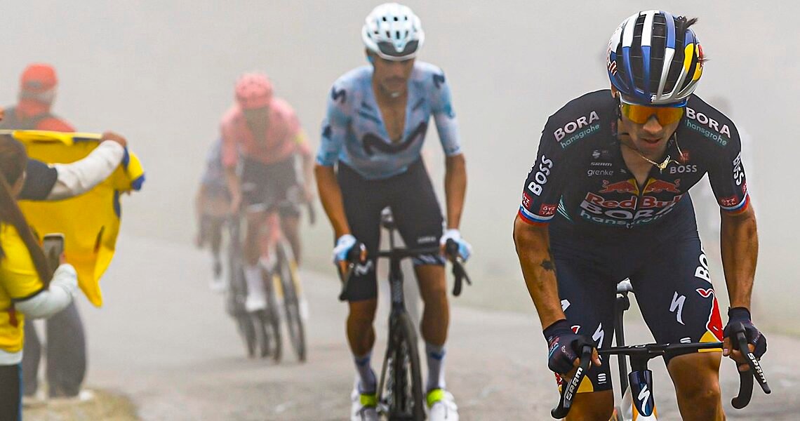 In line with the frantic action of the last few days, the attackers initiate a fierce battle from the gun. Kasper Asgreen (T-Rex Quick-Step), Kaden Groves (Alpecin-Deceuninck), Victor Campenaerts, Sylvain Moniquet (Lotto Dstny), Mauro Schmid (Jayco AlUla), Simon Guglielmi, Mathis Le Berre (Arkéa-B&B Hotels), Enzo Leijnse (dsm-firmenich-PostNL) and Ruben Fernandez (Cofidis) were first to get away. Marc Soler, Jay Vine (UAE Team Emirates), Kim Heiduk (INEOS Grenadiers), José Felix Parra (Kern Pharma), Nicolas Vinokourov (Astana Qazaqstan) and Xabier Isasa (Euskatel-Euskadi) join them, and they’re quickly followed by Wout van Aert (Visma | Lease a Bike) and Luca Vergallito (Alpecin-Deceuninck). Brandon McNulty (UAE Team Emirates), Sam Oomen (Lidl-Trek), Michael Woods, Dylan Teuns (Israel Premier Tech), Gijs Leemreize (dsm-firmenich-PostNL), Mikel Bizkarra and Xabier Isasa (Euskaltel-Euskadi) eventually make it a 24-man breakaway. But Isasa was dropped.