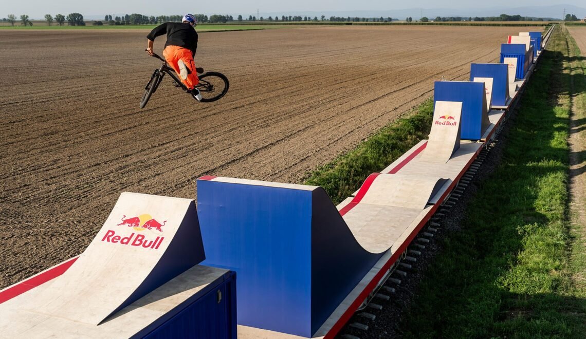 Built on ten train cars provided by Grupa Azoty Koltar the Red Bull Bike Express course featured eight jumps, a roller and a stair drop. The final flat drop backflip was a world’s first on a mountain bike.
