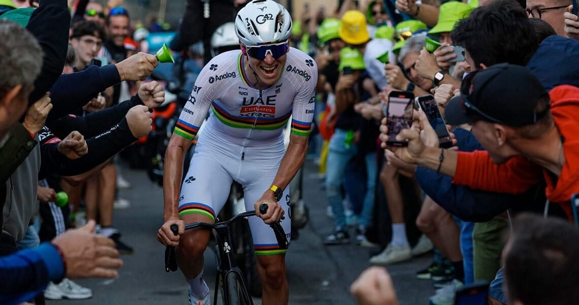 Up ahead, Simmons was riding heroically but hopelessly. The world champion reeled him in with 3.1 km to go, gave him a brief look, and then dropped him like a bad habit 300 meters later. By the top of the Ganda, Pogačar had over a minute in hand. Game over.