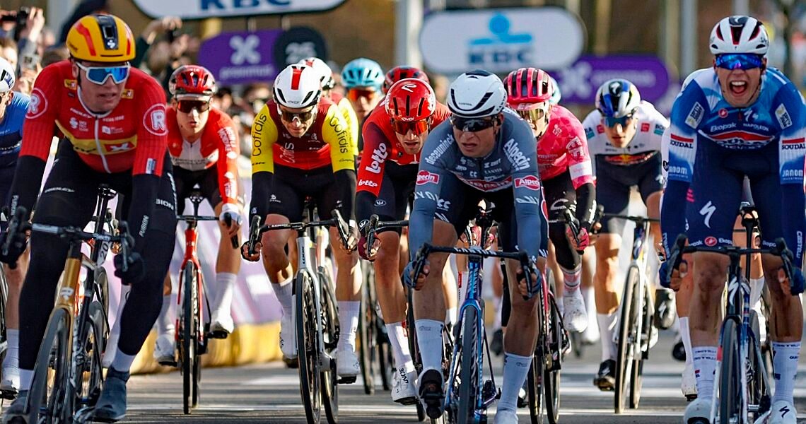 There was no real attack on the Molenberg, but the peloton split into several pieces. At the top, 42 kilometres from the finish, De Lie, last years winner Jan Tratnik and Wout van Aert had to chase back on. They had been in a second group. Alpecin-Deceuninck had not missed the move and had five men at front with Kaden Groves and Jasper Philipsen. The Belgian team continued to ride at full speed to the Berendries. In the Van Aert group; Visma | Lease a Bike had started to chase.