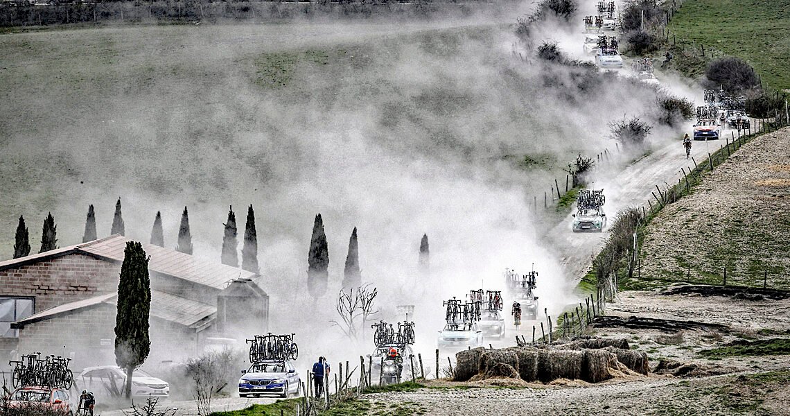 The name given to the strade bianche, or βwhite roadsβ which comprises 63 of the raceβs 184 kilometres (in 2025 there are 81.7 kilometres of gravel in the 213 kilometres). Itβs the alabaster in the soil which gives the sterrati their unique appearance, itβs a soft mineral, often used for carving, and is processed for plaster powder. The ancient Etruscan civilisation β as in GP Costa del Etruschi β were famed for their use of the materiel and itβs still mined in the region.