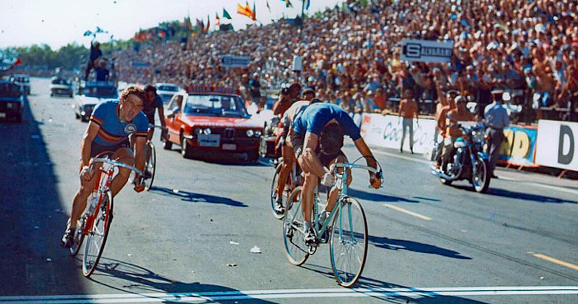 The following year, Merckx was back in rainbow bands after the 1974 Montreal Worlds but Maertens had again come in as a strong favourite. Legendary Belgian soigneur, Gus Naesens handed Maertens’ bidons up that day and later confessed that he’d ‘spiked’ them to insure against a Maertens win. . .
