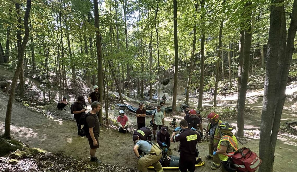 As one friend called 911, another rode to the highway to help direct the EMS services once they arrived. My injured friend slowly came to. He was disoriented. The blood from his mouth was from a split lip. His hand was bothering him. Before long paramedics and firefighters came hiking through the woods. When they got my friend on a backboard and started hiking him out of the bush. His girlfriend followed the backboard, carrying the extra bike. We were left to ourselves. Stunned. Wondering if we still wanted to ride.